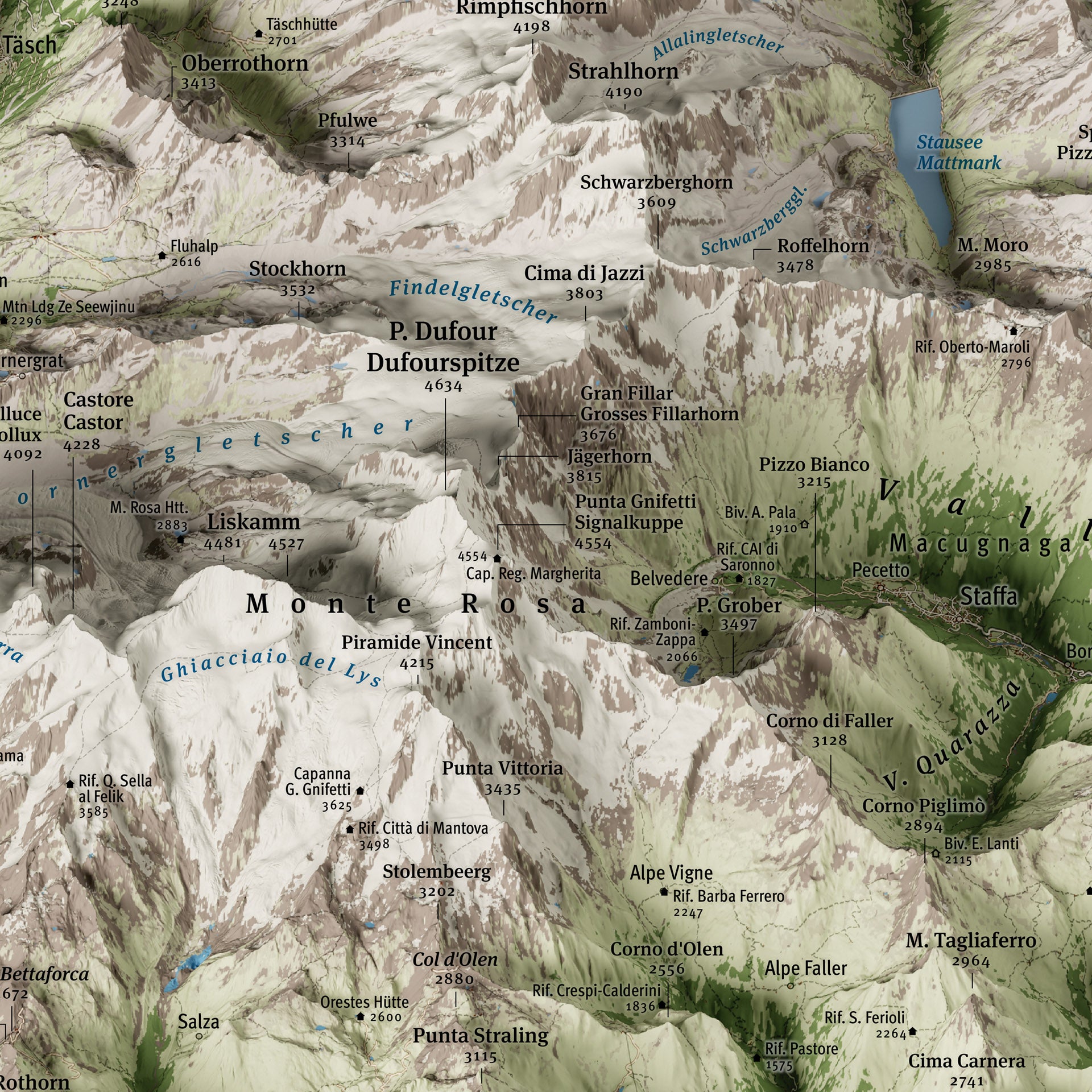 Realizzata in proiezione ortografica obliqua, unisce precisione cartografica e realismo visivo per restituire la vera tridimensionalità del paesaggio alpino.