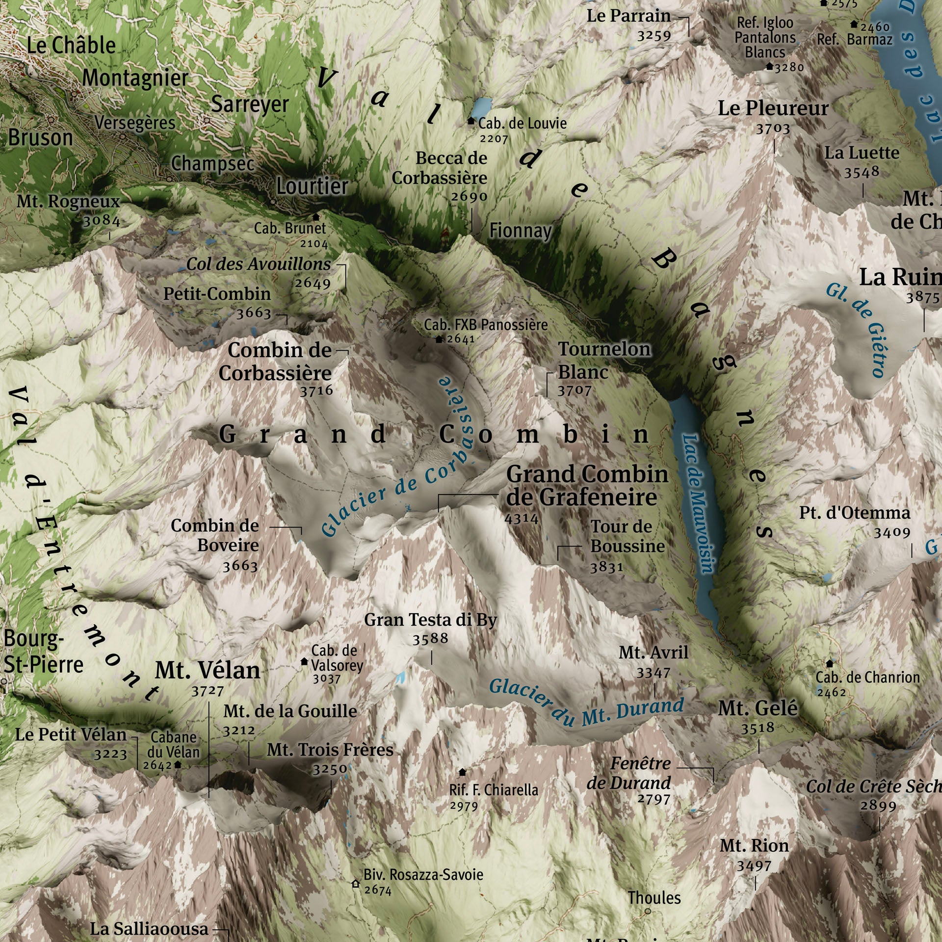 Questa mappa offre una visione unica delle Alpi Pennine, dal massiccio del Monte Rosa fino al Grand Combin, con la cornice spettacolare delle valli valdostane e del Vallese.